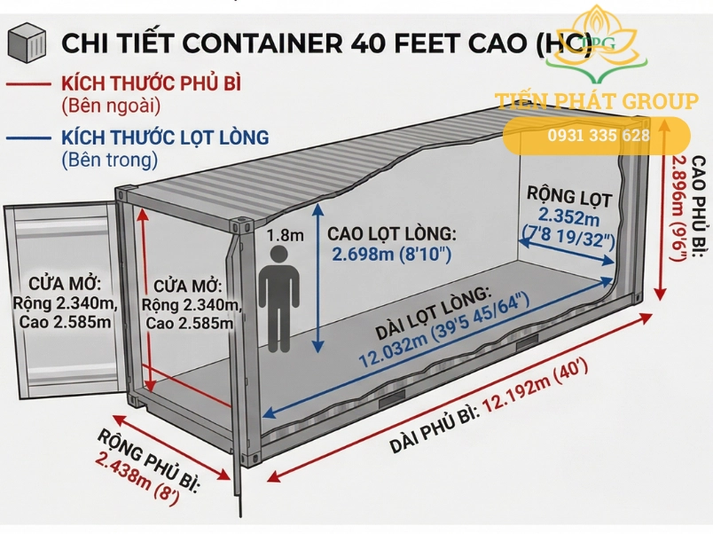 Nếu bạn đang cần tư vấn kích thước phù hợp hoặc dịch vụ rút container 40 feet bằng xe cẩu, hãy liên hệ Tiến Phát Group qua Hotline 0931 335 628 để được hỗ trợ nhanh chóng tại khu vực Đồng Nai, Bình Dương và TP.HCM.