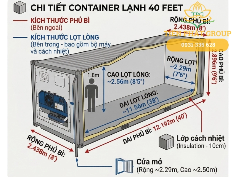 Container 40 feet lạnh (40RF/40HR) có kích thước phủ bì đạt 12.192m x 2.438m x 2.896m và lọt lòng 11.583m x 2.290m x 2.562m (chiều dài bị thu hẹp do cụm máy lạnh). Đây là giải pháp không gian hoàn hảo cho chuỗi cung ứng hàng hóa yêu cầu kiểm soát nhiệt độ khắt khe.