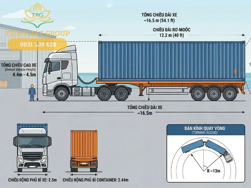 | Chiều dài tổng | 16m – 17m | Đầu kéo + rơ-moóc + container |